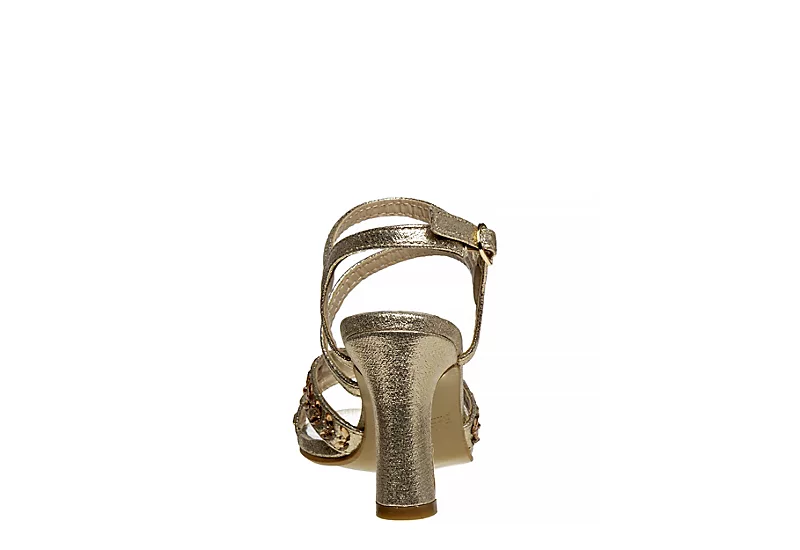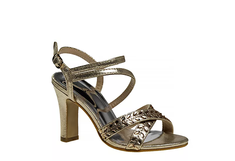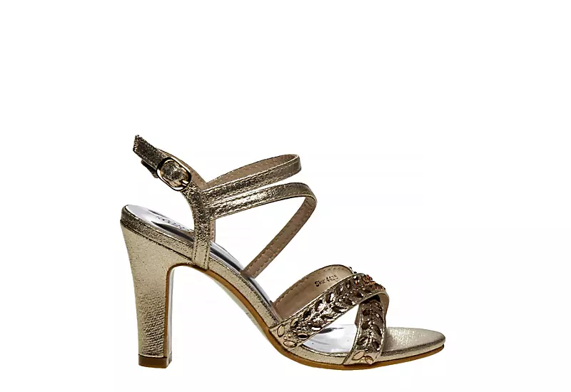 She’ll look stunning in the Badgley Mischka Strappy Metallic girls’ dress sandal. With a synthetic upper featuring leaf-shaped embellishments for extra flair, this buckle strap sandal brightens up any special occasion. The lightly cushioned footbed soothes her foot, while she navigates that generous, but stable 3″ heel as it accentuates her ankle for a flattering look.Â