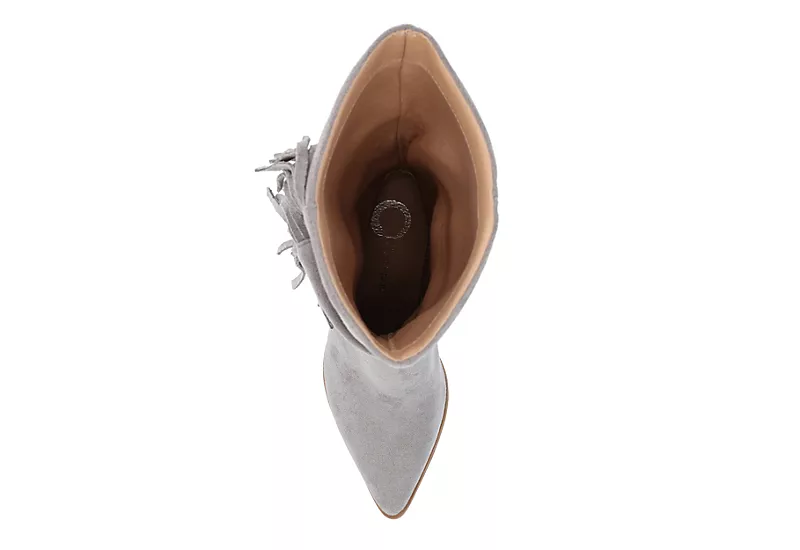 Flaunt a fun, flirty look with the Hartly Wide Calf women’s fringed dress boot from Journee Collection. With a vegan leather upper featuring a partial inside zipper for a convenient fit and accentuated by a slouchy shaft and fringe accents, this pointy-toe boot looks great with jeans and dresses. A Tru Comfort Foamâ„¢ footbed cushions your feet, while the stacked block heel creates a stunning lift.
