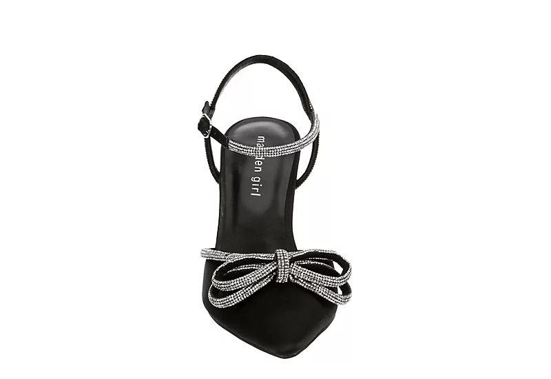 Make a stylish statement in the Dreamy women’s pump from Madden Girl. This head-turning design features a satin upper with rhinestone accents, a glittery bow detail, a sleek pointed toe, and a thin ankle strap that adjusts for a perfect fit. A padded footbed soothes your feet, while the 3½” stiletto heel elevates your look, and the TPR outsole provides excellent grip.Â