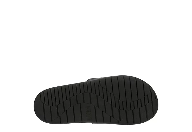 Looking cool and feeling cool are one-in-the-same in the PUMA Softride men’s slide sandal. With a faux leather upper featuring soft padding for comfort, this slide has the PUMA Wordmark and cat logo. The SOFTRIDE footbed cushions every step, making them great for the beach or a barbecue.